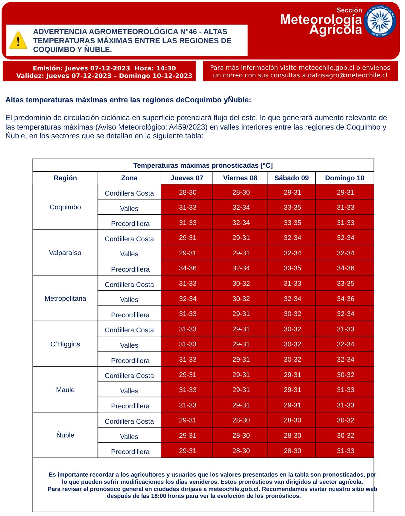 La Dirección Meteorológica de Chile emitió una nueva advertencia agrometeorológica por “altas temperaturas máximas” en seis regiones del país: Coquimbo, Valparaíso, Metropolitana, O’Higgins, Maule y Ñuble. El evento se extenderá hasta el domingo 10 de diciembre.