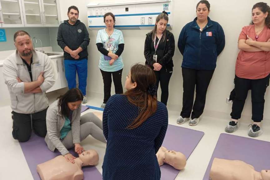 La primera actividad desarrollada fue el Curso de Reanimación Cardiorrespiratoria Básica (RCP), en el que participaron cerca de 60 funcionarios y funcionarias entre profesionales, técnicos y auxiliares de distintos servicios. Durante la jornada, los equipos practicaron maniobras de reanimación, identificación de situaciones de paro cardiorrespiratorio y protocolos de respuesta ante emergencias vitales, bajo la guía de enfermeras especialistas en UCI, Anestesia y Pabellón del Hospital Clínico Herminda Martín (HCHM).