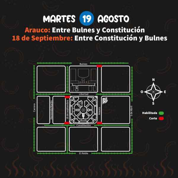 Con los decretos y la venia de la Seremi de Transportes, el inicio paulatino de la suspensión de tránsito partirá este martes 19 en la calle Arauco, entre Bulnes y Constitución. A su vez, la calle 18 de Septiembre, también entre Constitución y Bulnes, verá interrumpido su tránsito en las mismas fechas. El miércoles 20 se suspenderá el tránsito en calle Constitución, entre 5 de Abril y 18 de Septiembre, mientras que la avenida Libertad verá interrumpido su trayecto entre 5 de abril y Carrera, también retornando a la normalidad el martes 26 de agosto.