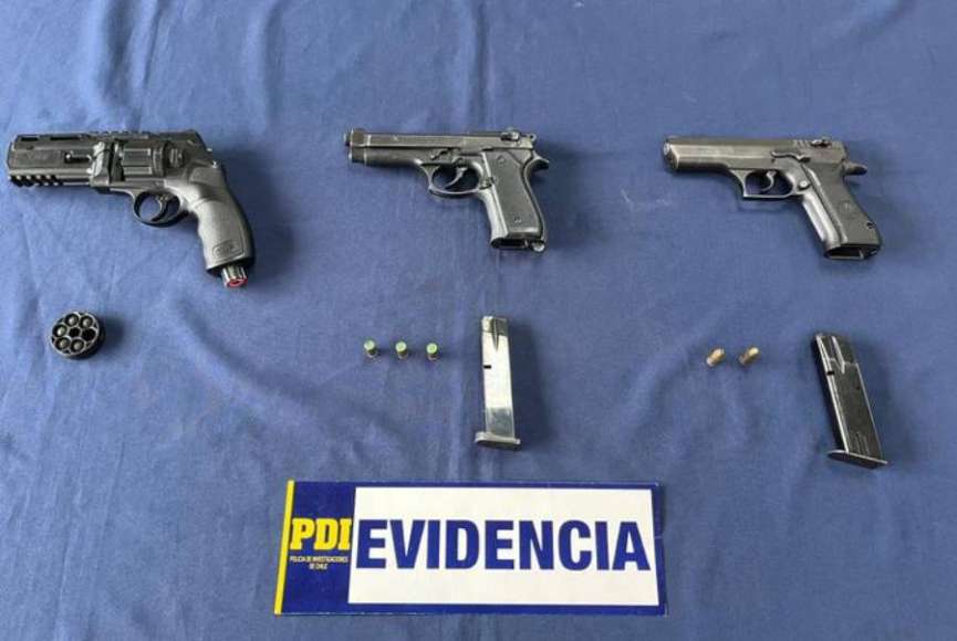 “Durante las diligencias investigativas y el registro autorizado del inmueble, los oficiales incautaron dos pistolas, un revólver, cartuchos de municiones y balines de goma, elementos que fueron levantados como evidencia por el personal especializado” señaló el jefe de la unidad especializada subprefecto Jonathan Silva Concha.