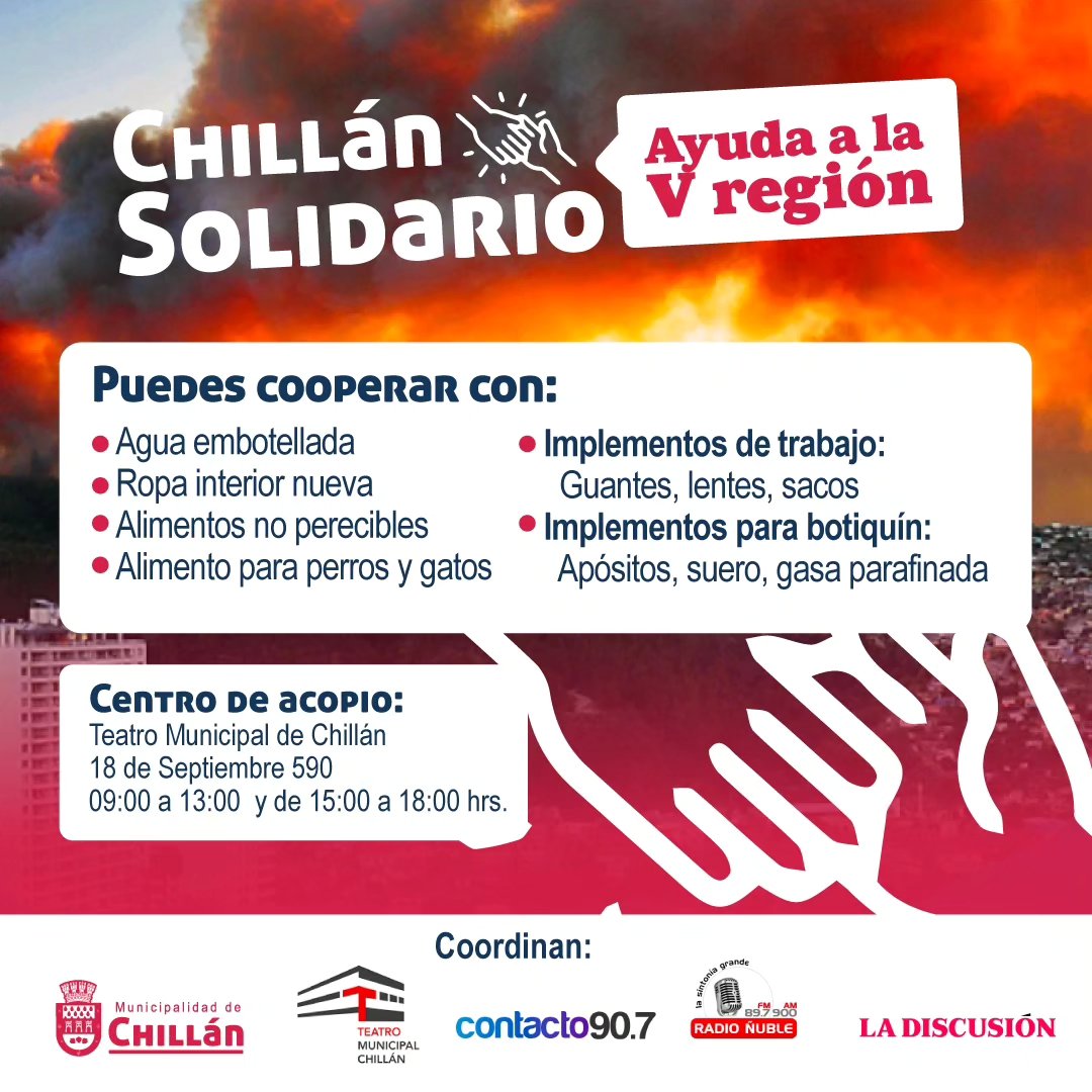 El alcalde de Chillán, Camilo Benavente, invitó a la comunidad a solidarizar con los afectados de los incendios. “Estamos recibiendo todo tipo de insumos en nuestro Teatro Municipal, en horario de oficina. Desde la Municipalidad de Viña del Mar, su Directora de Desarrollo Comunitario, Camila Estay nos ha solicitado algunas cosas que son bien especiales, útiles de aseo fundamentalmente, carpas, bloqueadores, linternas, guantes y alguna mesa plegable. Son cosas bien especiales, además de todos los otros insumos que están llegando y agradecerle a la comunidad”, destacó.