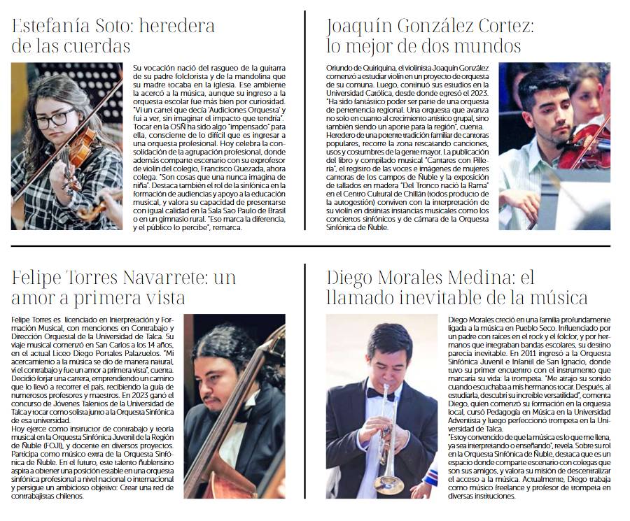 A pocos meses de cumplir cuatro años, la Orquesta Sinfónica de Ñuble sigue firme en su misión de democratizar el acceso a la cultura y posicionarse como una de las mejores del país. Esta institución, además, se ha convertido en una fuente laboral para músicos profesionales provenientes de distintas comunas de Ñuble, que, con su talento y compromiso han contribuido a consolidar este proyecto regional, que inspira a nuevas generaciones a seguir el camino de la música. Según información proporcionada por la propia Orquesta Sinfónica, varios de sus integrantes comenzaron en elencos escolares, y tras una primera formación en escuelas y liceos, optaron por profesionalizarse en universidades como la de Talca, la Católica y la de Chile.