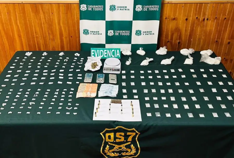 En este operativo, Carabineros del OS7 incautó diversas dosis de pasta base, cocaína y marihuana, además de balanzas digitales, 20 cartuchos y más de 360 mil pesos en efectivo.