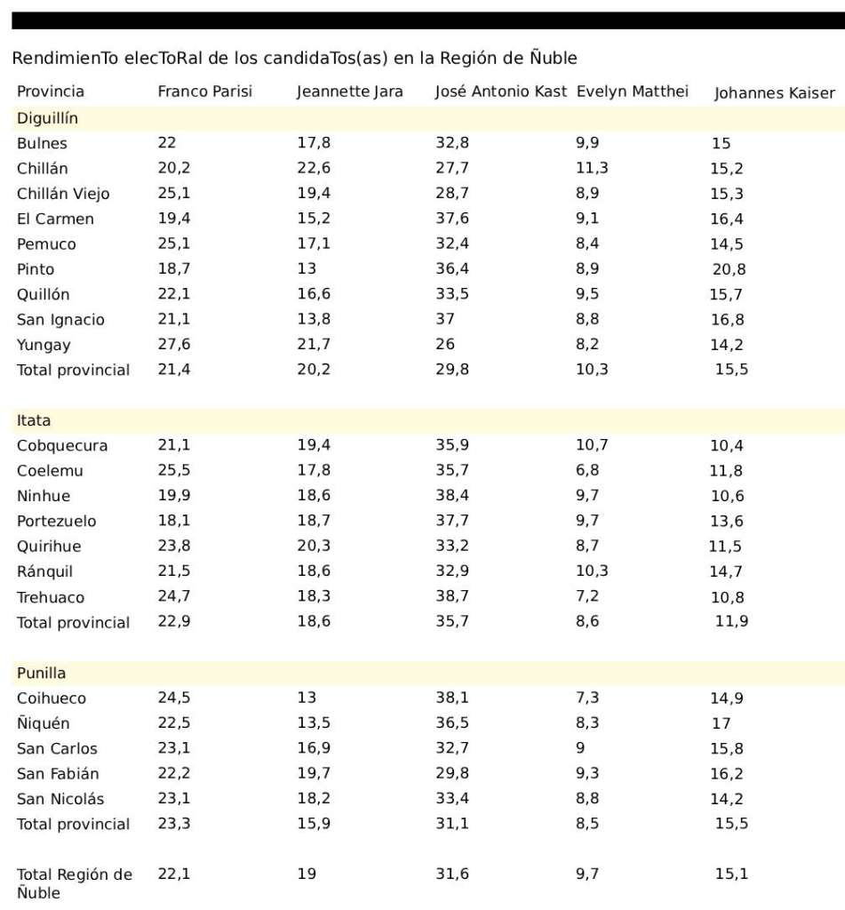En Diguillín, Jara obtiene su porcentaje más alto (20,2%), ayudada por la densidad urbana de Chillán y Chillán Viejo, aunque aun ahí el bloque de la derecha supera ampliamente el 45% sumando a Kast, Matthei y Kaiser.