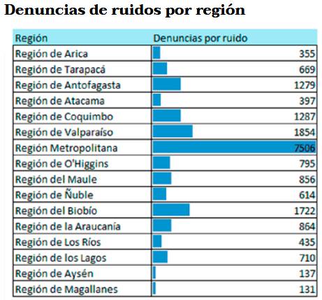 A nivel nacional, durante 2024, las regiones con mayor cantidad de denuncias por ruido fueron la Metropolitana (38%), Valparaíso (9%) y Biobío (9%), que en conjunto concentraron el 57% del total nacional. En paralelo, la Superintendencia del Medio Ambiente (SMA) ejecutó 918 fiscalizaciones asociadas a ruidos molestos, marcando el mayor número registrado por la institución desde su creación.