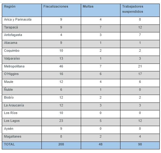 Las tres regiones con más trabajadores suspendidos fueron la Metropolitana (21), O’Higgins (17), Tarapacá (12) y Los Lagos (12).