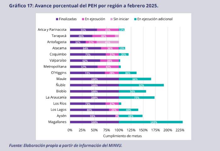 Las regiones del norte han mostrado avances más lentos; en Antofagasta hay solo un 32% de avance y 45% de viviendas sin iniciar. Pese a esto, en regiones como Arica y Parinacota y Atacama se están ejecutando más viviendas que las contempladas originalmente. Otro caso relevante es el de la región Metropolitana y Valparaíso, donde un 40% de las viviendas se encuentran en ejecución a solo un año del término del gobierno. En tanto, las regiones del sur superan la meta anualizada del PEH. Por otra parte, las regiones con mayor aumento en la ejecución de unidades habitacionales son la Magallanes, Ñuble y Los Lagos.