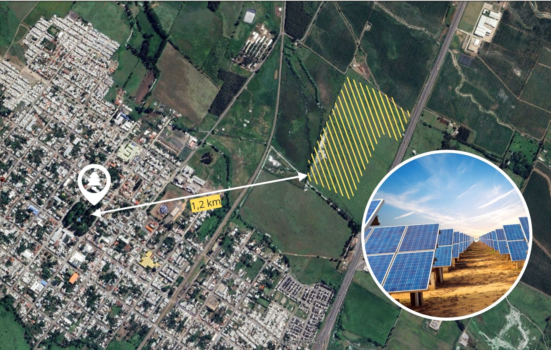 El proyecto se emplazará a 1,2 kilómetros de la plaza de armas de Bulnes, a un costado de la Ruta 5, en un predio de 21,5 hectáreas de suelos con aptitud agrícola, de las cuales 16,1 hectáreas serán cubiertas por los paneles.