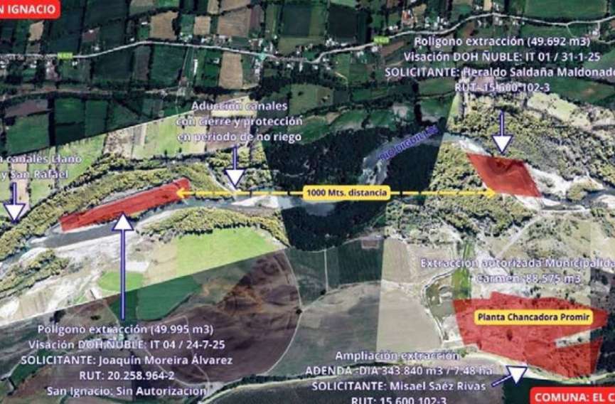 La Junta de Vigilancia del Río Diguillín (JVRD), junto a los vecinos del sector Santa Juana, de San Ignacio, presentaron denuncias ante los organismos respectivos, ya que las faenas de extracción, además de afectar la captación de agua para riego, también tienen impactos en el medio ambiente, en la calidad de vida de los vecinos y en las obras de encauzamiento que el MOP ejecutó el año pasado para brindar protección frente a crecidas.