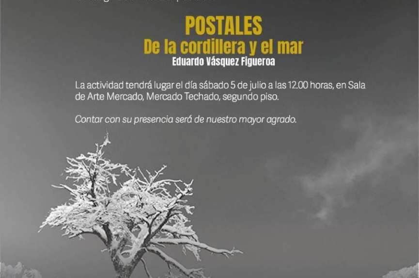 Este sábado, al mediodía se inaugura en la Sala Arte Mercado la exposición fotográfica “Postales de la cordillera y el mar”, del reconocido fotógrafo Eduardo Vásquez. La muestra, organizada por la Dirección de Cultura, Artes y Patrimonio del municipio de Chillán en colaboración con la propia sala, promete ser un deleite para los sentidos y el alma.