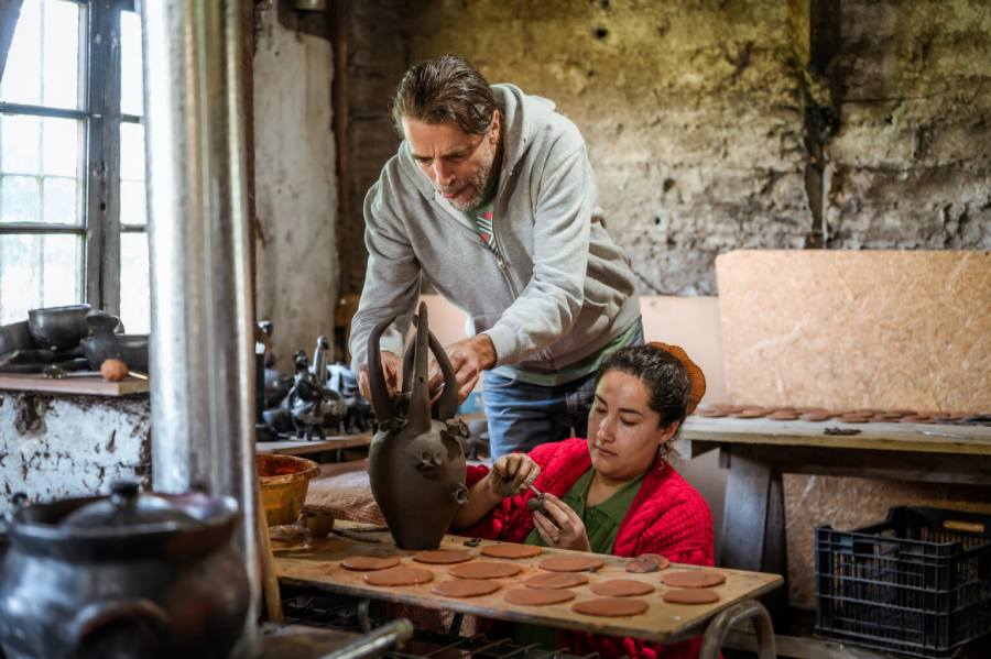 La muestra, que se enmarca en una nueva vinculación de la Universidad de Concepción Campus Chillán con la Bienal Internacional de Arte Contemporáneo del Sur, BienalSur, presentará como resultado el proceso colaborativo que ambos artistas continúan desarrollando durante una residencia creativa en Quinchamalí, desde el 23 hasta el 30 de septiembre. Durante estos días, el destacado ceramista argentino Leo Battistelli –uno de los grandes referentes de la cerámica contemporánea y radicado en Río de Janeiro– ha compartido saberes y procesos con Nayadet Núñez, reconocida artesana de Quinchamalí, localidad icónica de la cerámica tradicional de Chile, distinguida por su arcilla negra y su rica iconografía rural.